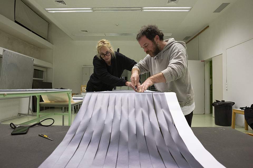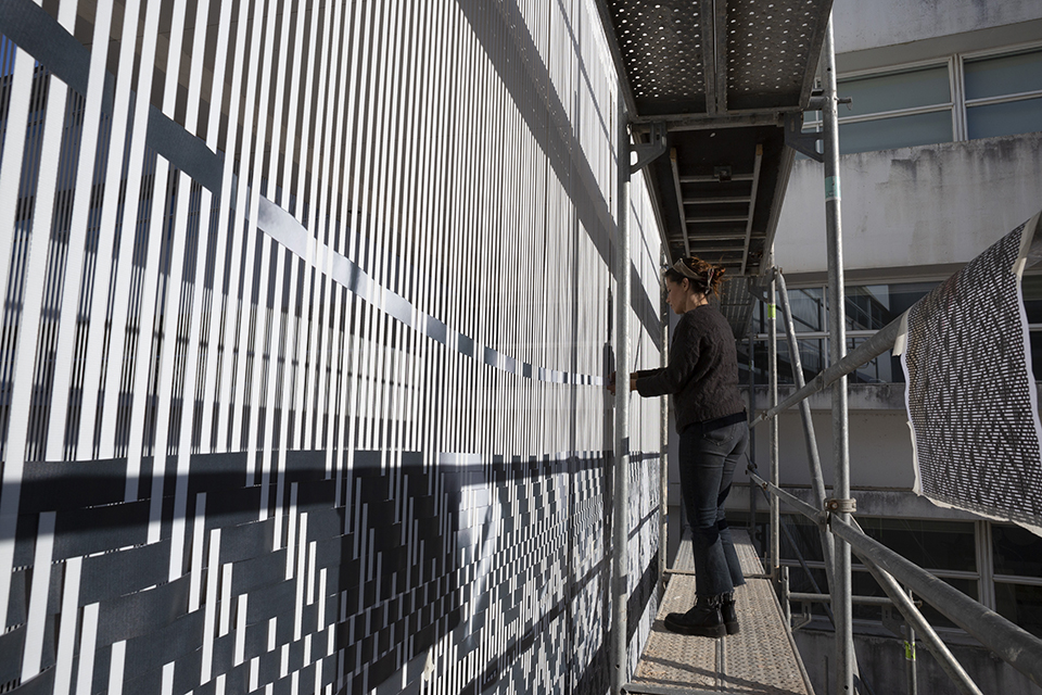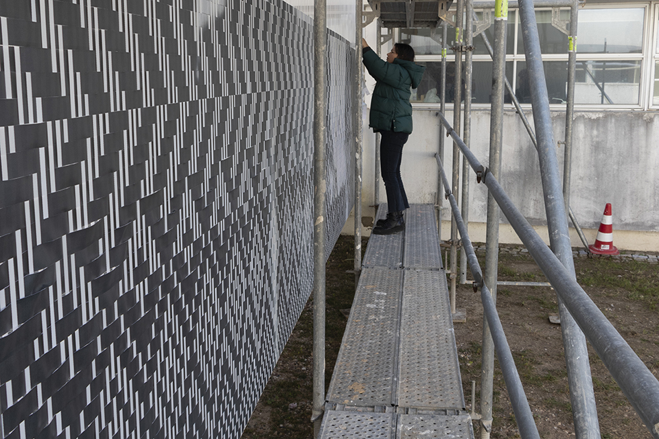 Using this technique, Raquel Belli will weave a large format image into the strips that support and shape CUBÍCULO. The image chosen is a photograph by Erich Consemüller from 1927, alluding to the little known or unknown women of the Bauhaus, entitled “Marcel Breuer and his Harem (Martha Erps, Katt Both and Ruth Hellos)”, which, in her own words “represents the exact opposite of what the title describes. They completely dominate the picture with confidence and attitude, in contrast to Breuer’s gaze, as if supervising their behavior (…) I had been thinking of doing something with this theme for some time. The decade we are in celebrates the centenary of the Dessau school, and I have always associated the building in Caldas, designed by Vítor Figueiredo, with a mixture of modernisms, but very much in the Bauhaus way, an art school in the middle of a forest (…) Starting from the little recognized work of the women of the Bauhaus, particularly in the importance they had in spreading tapestry as an art, I chose this photo.”