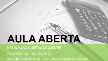 Aula Aberta (17/11/2022) Título do evento: Negociação e gestão de clientes Orador: Rui Costa Resumo da comunicação: ver cartaz Horário de realização da comunicação: 13h00 – D.S. 00.12A Organizadores do evento: Licenciatura em Marketing – UC: Gestão e Negociação Comercial