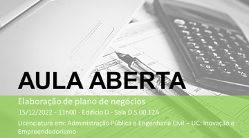 Aula Aberta (15/12/2022) Título do evento: Elaboração de plano de negócios Orador: Dr. João Barroca Resumo da comunicação: ver cartaz Horário de realização da comunicação: 11h00 – D.S. 00.12A Organizadores do evento: Licenciatura em: Administração Pública e Engenharia Civil – UC: Inovação e Empreendedorismo
