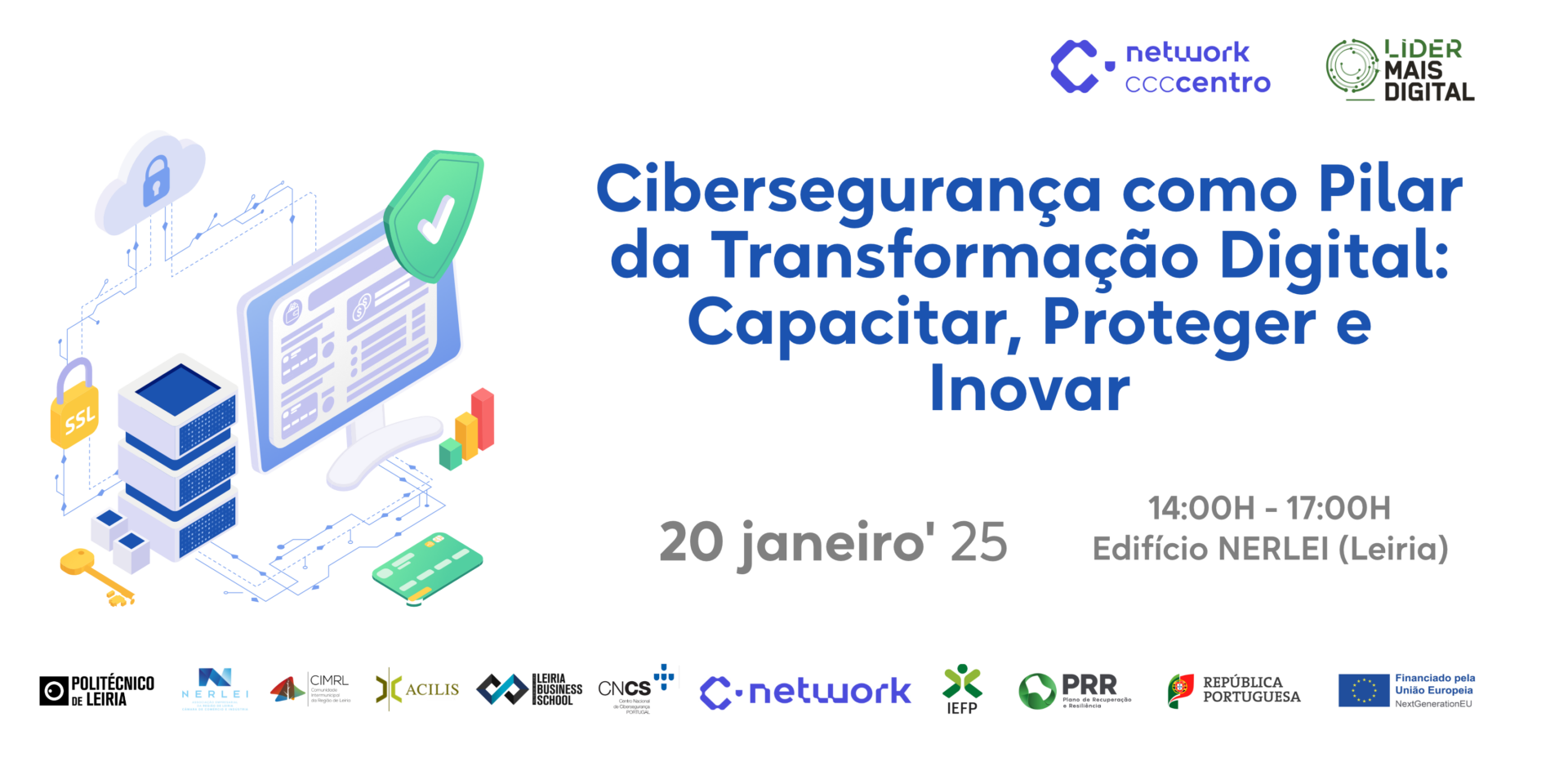 O Centro de Competências em Cibersegurança do Centro (CCC-Centro) e o consórcio constituído pelo Politécnico de Leiria, NERLEI-CCI, Comunidade Intermunicipal da Região de Leiria, ACILIS e Leiria Business School, no âmbito do projeto “Lider + Digital”, juntaram-se para organizar um evento na área da Cibersegurança e da Transição Digital, no dia 20 de janeiro de 2025, pelas 14 horas, no Edifício da NERLEI, em Leiria.