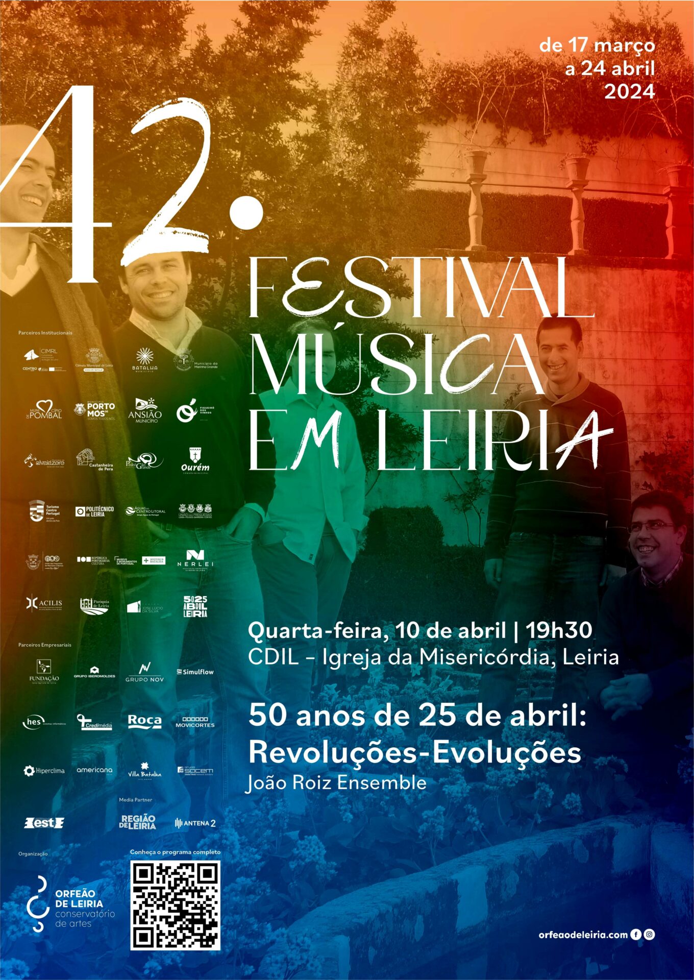 O Orfeão de Leiria e o Instituto Politécnico de Leiria convidam toda a comunidade académica a assistir ao concerto “50 anos de 25 de abril: Revoluções-Evoluções” – João Roiz Ensemble, a ter lugar no próximo dia 10 de abril de 2024, às 19h30, no Centro de Diálogo Intercultural de Leiria (CDIL) – Igreja da Misericórdia (Rua Miguel Bombarda, nº 15), em Leiria. O concerto insere-se no programa da 42.ª Edição do Festival Música em Leiria e conta com o apoio/parceria do Politécnico de Leiria.