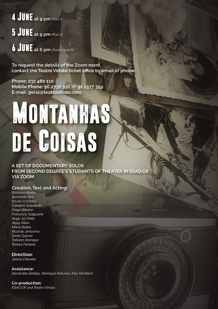 “Montanhas de Coisas” is a set of documentar solos created by the students of the 2nd year of the degree in Theater from ESAD.CR. Each actor chose a theme, whici investigated in depth and in confinement, seeking to deepen their relationship with Portuguese political memory , their family, their place of origin, as well as recognizing, in this process, that looking close brings with it surprising revelations, and that the best story is sometimes the one that is right there, next to us, ahead, before us. This is a show about the search process. This a show about opening drawers, lifting sheets, and peeking under the bed – to see if the spirits are still there…