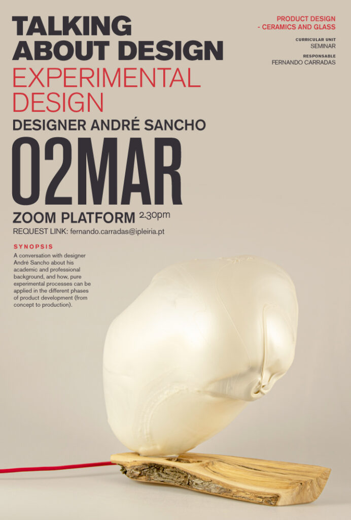 A conversation with designer André Sancho about his academic and professional background, and how, pure experimental processes can be applied in the different phases of product development (from concept to production) General objectives: Support the development of individual projects in the scope of Final Project and Integrated Project in Company Pedagogical objectives: Identification and analysis of the following aspects: -Concepts -Project practices vs Materials vs Production methods -Products/Works