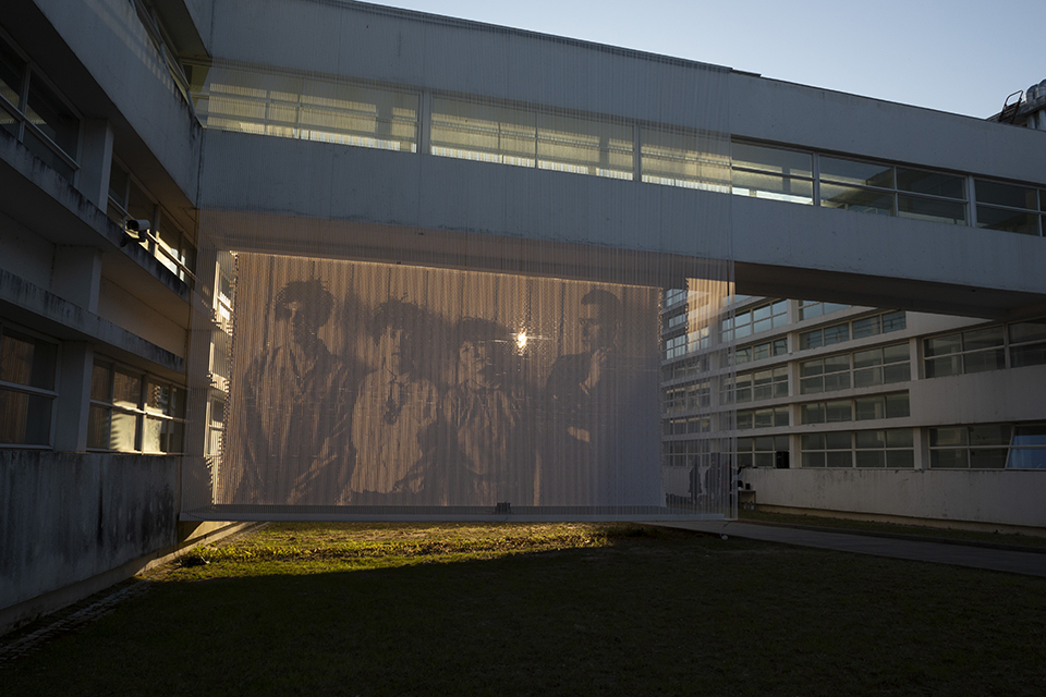 Using this technique, Raquel Belli will weave a large format image into the strips that support and shape CUBÍCULO. The image chosen is a photograph by Erich Consemüller from 1927, alluding to the little known or unknown women of the Bauhaus, entitled “Marcel Breuer and his Harem (Martha Erps, Katt Both and Ruth Hellos)”, which, in her own words “represents the exact opposite of what the title describes. They completely dominate the picture with confidence and attitude, in contrast to Breuer’s gaze, as if supervising their behavior (…) I had been thinking of doing something with this theme for some time. The decade we are in celebrates the centenary of the Dessau school, and I have always associated the building in Caldas, designed by Vítor Figueiredo, with a mixture of modernisms, but very much in the Bauhaus way, an art school in the middle of a forest (…) Starting from the little recognized work of the women of the Bauhaus, particularly in the importance they had in spreading tapestry as an art, I chose this photo.”