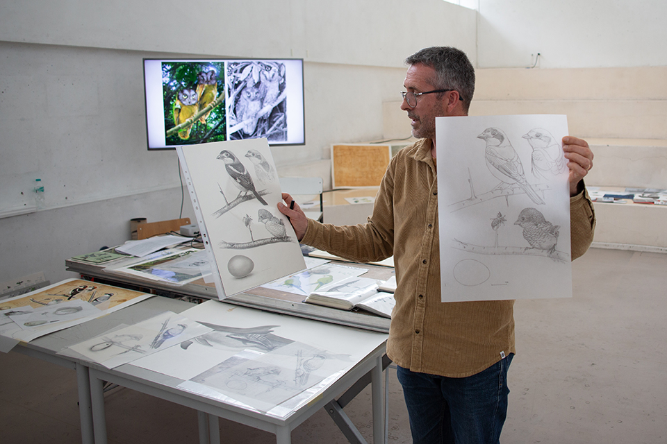 Marco Nunes Correia Alcobaça, 1973. Graduated in Communication Design, FBAUL, 1998. Specialist in scientific illustration, 2013. He has taught scientific illustration and drawing since 2010, in several undergraduate and master’s courses, and is currently part of the teaching staff at ESAD.CR – Polytechnic of Leiria. He supervised around a dozen master’s students in the area of ??scientific illustration. He is a collaborating member of the Design and Arts Research Laboratory (LIDA – Polytechnic of Leiria). He is a member of SPEA and has developed bird monitoring and scientific banding activities over the past ten years. He is a founding member of Grupo do Risco (2007), having participated in several field design expeditions, carried out in protected areas of Portugal, the Brazilian Amazon and São Tomé and Príncipe.