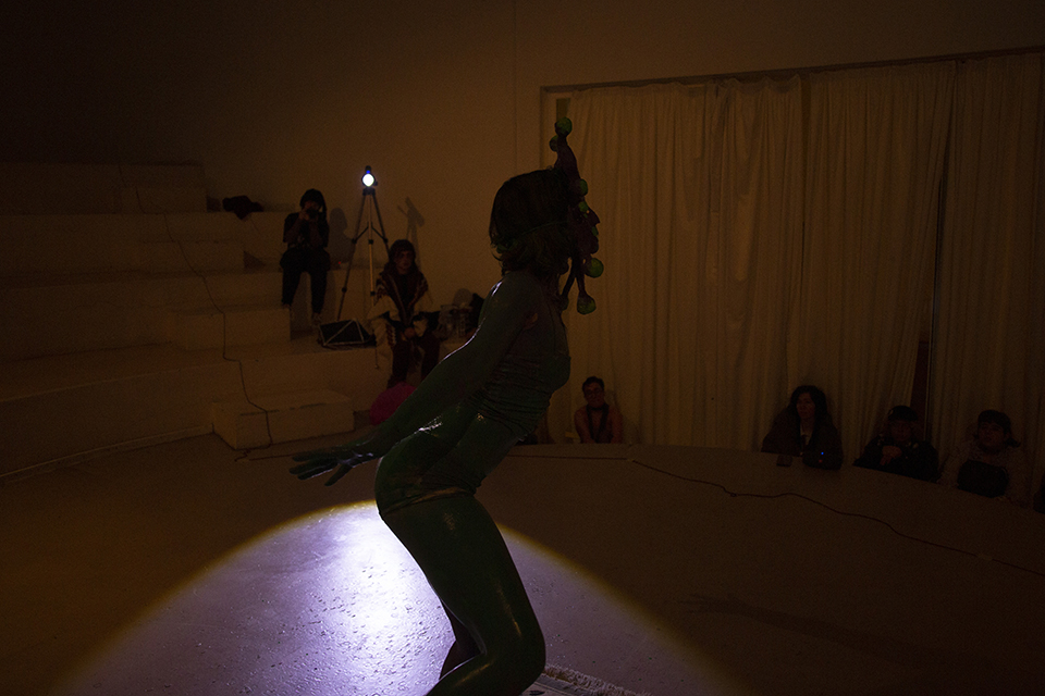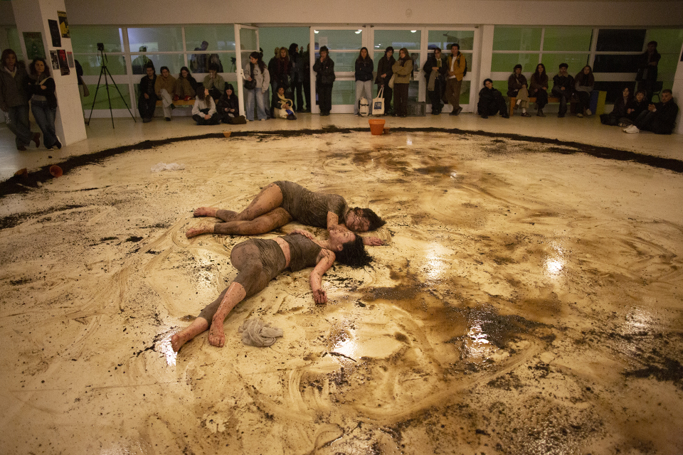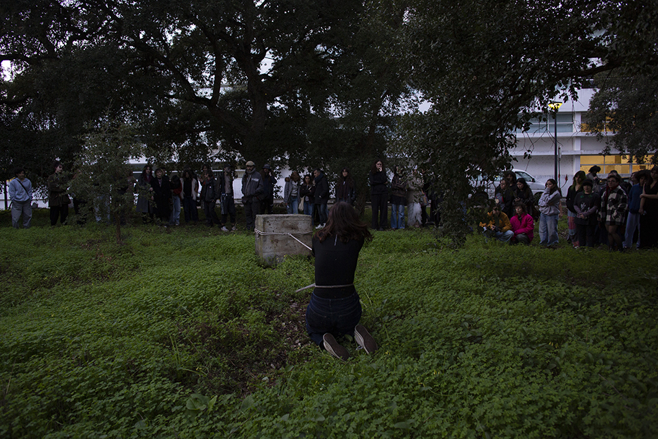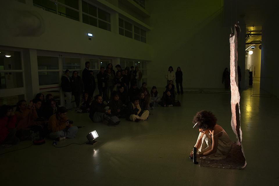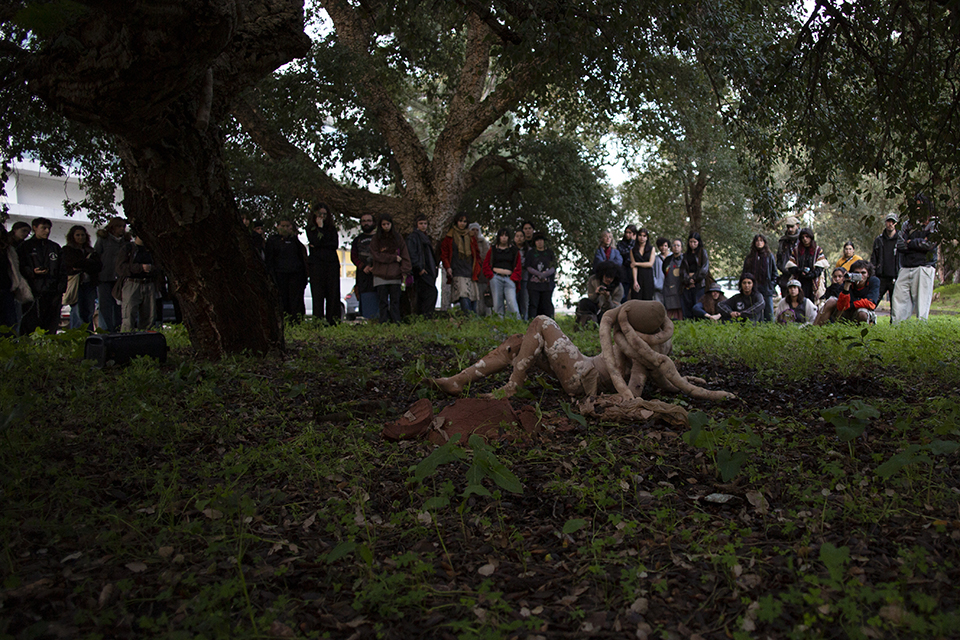 The performance show of the works carried out at UC performance, body and device aims first to experiment with a more conscious approach to the body in the context of creative processes, and how movement activates other ways of doing things that were not being looked at. With the support of masks, objects and other things, the bodies in performance show vulnerabilities that an exposed, untrained body can reveal.