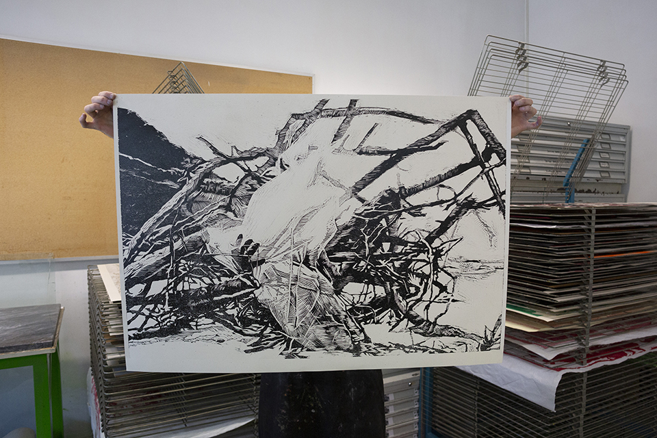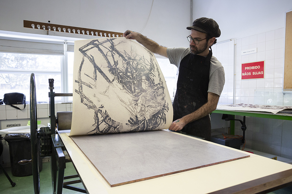 Taking advantage of ESAD.CR’s large-format press, we will invite graphic artists to make this climb in a workshop context, working on matrixes for printing in loco in two sessions of one day each. The only guiding rule will be to respect the unique printing format of 100cm x 70xm. Looking and working at this scale will slightly deplete this idea of finitude: depleting one limit will open up others.