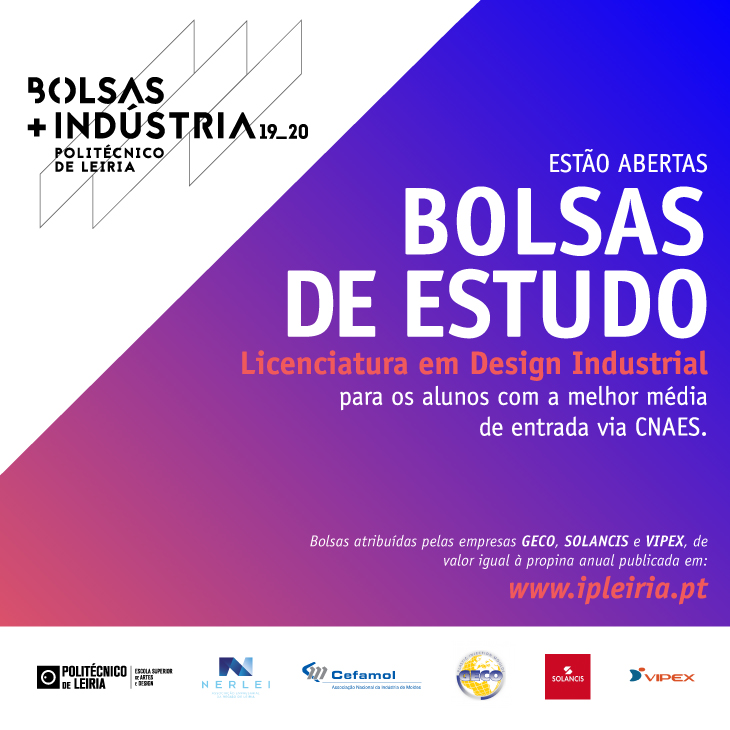 No âmbito deste protocolo, no ano letivo 2019-2020, serão atribuídas 3 BOLSAS DE ESTUDO PARA ESTUDANTES DA LICENCIATURA EM DESIGN INDUSTRIAL, cujo valor será igual à propina fixada e publicada em www.ipleiria.pt.