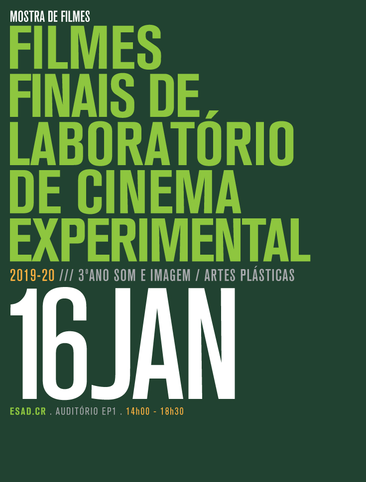 Mostra de Filmes Finais de Laboratório de Cinema Experimental, das turmas 3º ano de Som e Imagem e Artes Plásticas, dia 16 no Auditório da ESAD.CR, das 14h00 às 18h30.