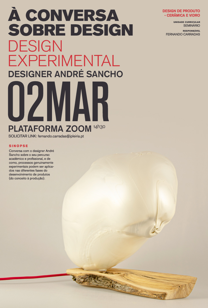Conversa com o designer André Sancho sobre o seu percurso académico e profissional, e de como, processos genuinamente experimentais podem ser aplicados nas diferentes fases do desenvolvimento de produtos (do conceito à produção) Objectivos gerais: Apoio ao desenvolvimento de projectos individuais no âmbito das U.C. ́s de Projecto Final e Projecto Integrado em Empresa Objectivos pedagógicos: Identificação e análise dos seguintes aspectos: -Conceitos -Práticas de projecto vs Materiais vs Modos de produção -Produtos/Obras