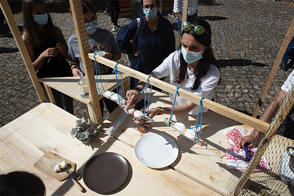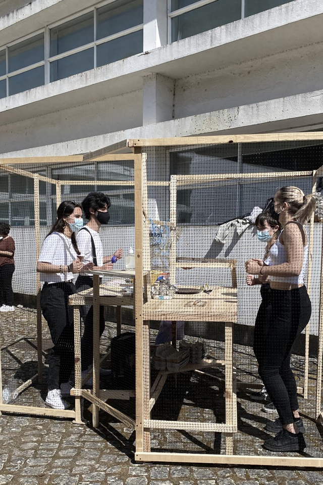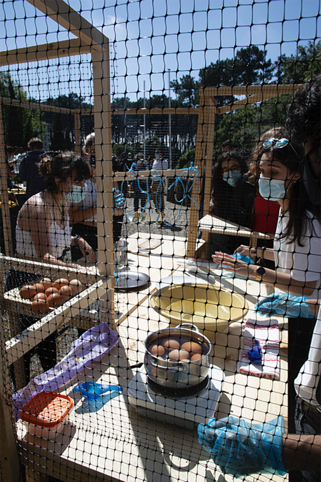 O exercício propôs a concepção, desenvolvimento e execução à escala real de uma estrutura para preparar, confeccionar e servir uma receita culinária específica. Este grupo de estudantes escolheu Ovos Recheados. A estrutura foi desenhada de forma a otimizar a produção e consumo dessa receita, articulando espaço para operadores (estudantes) e espaço para utilizadores finais (público). As propostas foram executadas em maquetes funcionais à escala real e apresentadas publicamente a toda a comunidade da ESAD.CR no dia 8 de junho de 2021.