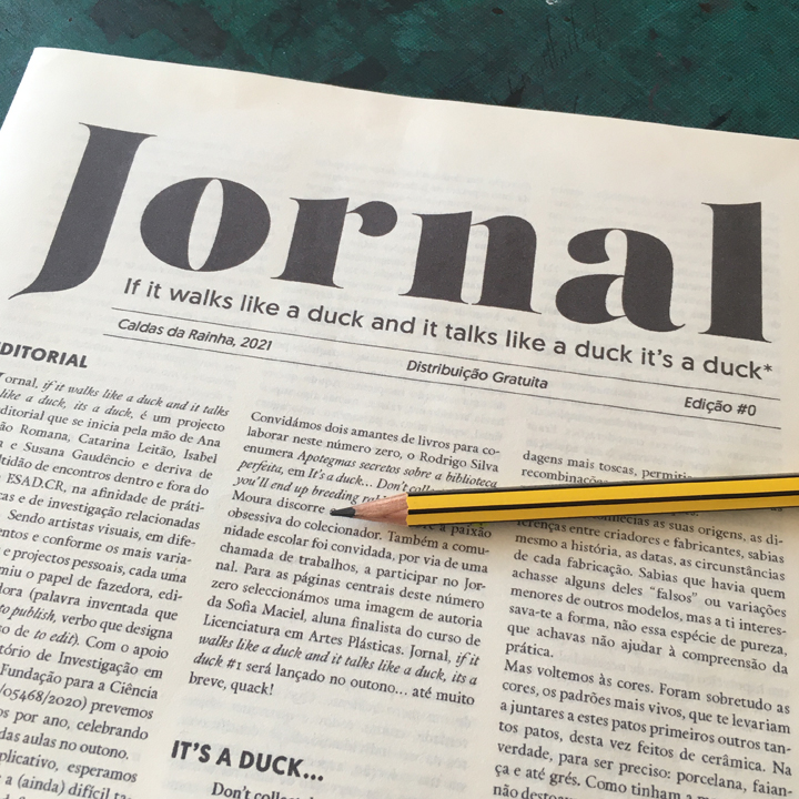 JORNAL, if it walks like a duck and it talks like a duck it’s a duck é uma publicação periódica dedicada aos livros de artista e à edição independente. Visa divulgar a produção científica acerca do que designamos como edição de autor, fomentar a colaboração entre artistas, editores, investigadores, estudantes e professores, que produzam ou que se debrucem sobre estes objectos, ou que estudem assuntos afins.