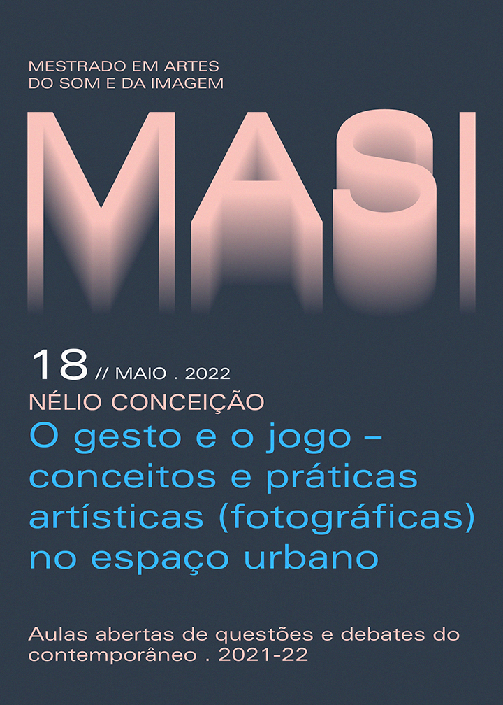 Esta sessão/aula aberta irá incidir sobre um conjunto de conceitos e práticas artísticas, próximas da fotografia, mas não se esgotando nela, que visam circunscrever um quadro de referências filosóficas e de casos de estudo em torno dos temas do gesto e do jogo no espaço urbano. Trata-se, por um lado, de analisar a pertinência da questão do gesto humano e do modo como ele é trabalhado pela fotografia e pelo cinema, fazendo ver a relação complexa que mantemos com o espaço e os outros. Trata-se, por outro lado, de analisar a relevância estética do conceito de jogo, o qual se relaciona, entre outros, com os temas do acaso ou com o exercício de uma liberdade política e/ou imaginativa. Perante a dimensão heterogénea e muitas vezes conflitual das nossas cidades, atender a estes conceitos e ao modo como as práticas artísticas as invocam é também uma tarefa contemporânea.