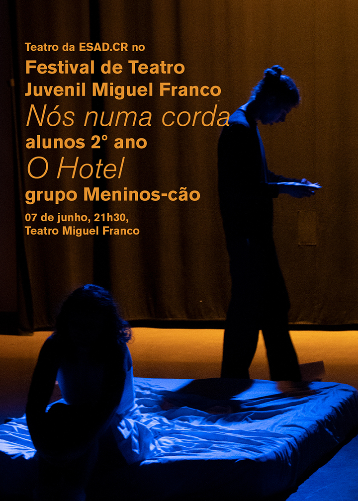 A licenciatura de Teatro da ESAD.CR levará à cena duas peças: “Nós numa corda” do Grupo do 2.º Ano e “O Hotel”, pelo grupo Meninos-cão, ambas vão ser apresentadas no dia 07 de junho, sexta-feira, às 21h30, no Teatro Miguel Franco.
