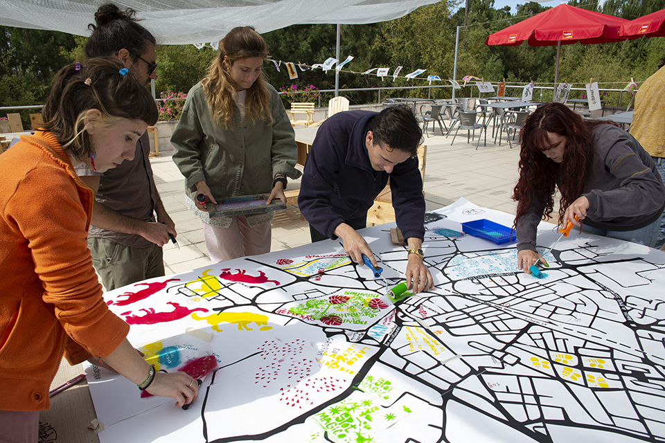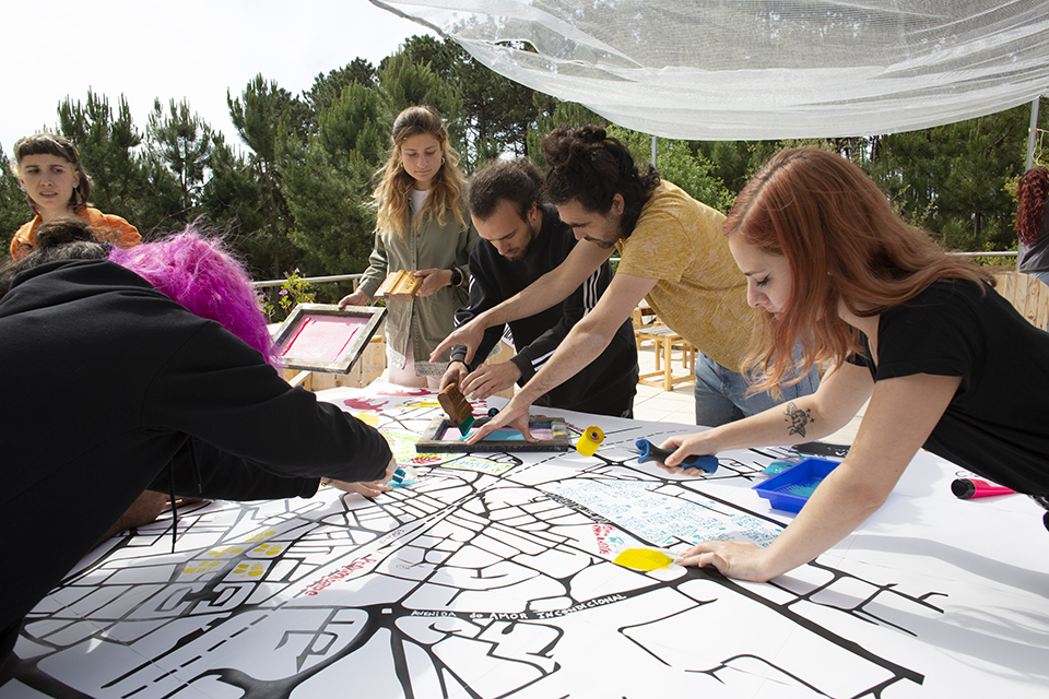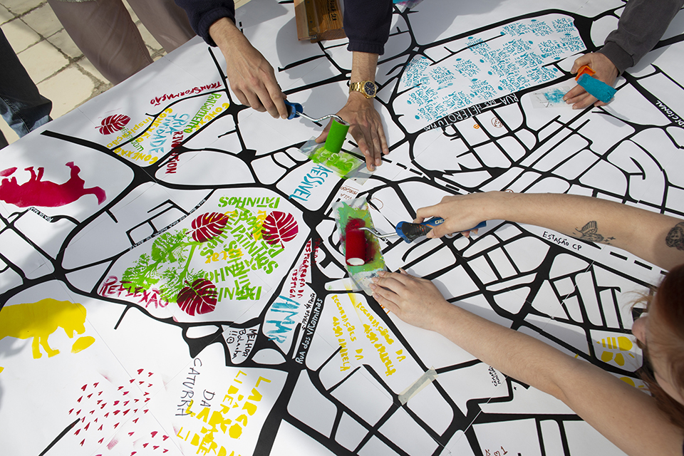 Cartografia Coletiva é o ponto de partida para uma performance espontânea que transforma temporariamente o espaço público numa relação entre o agir e o imaginar, atualizando um diálogo entre arte, cultura e cidadania. Pintar um mapa COMUM como metáfora de empoderamento da comunidade onde passantes são convidados a renomear as ruas da cidade com pensamentos que transmitam as suas próprias utopias.
