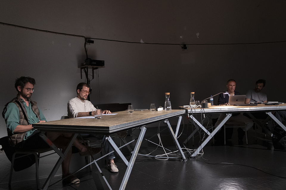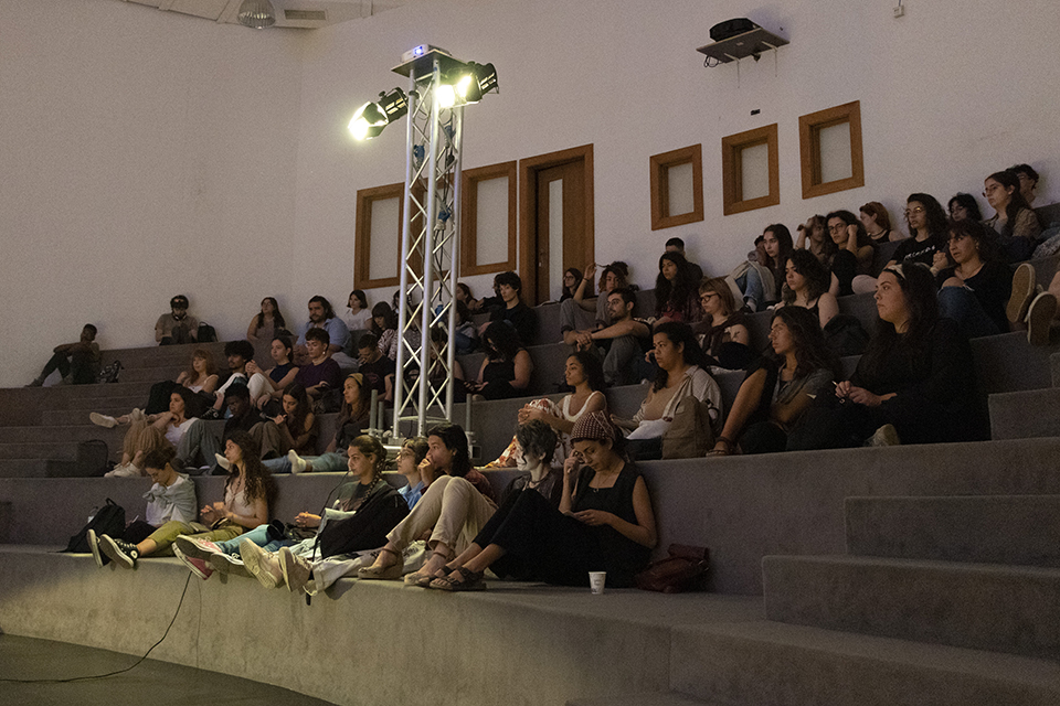 Num terceiro momento, a abrir a noite, desenhamos um círculo, um espaço de encontro, de rememoração e de troca em torno da exposição O Verdadeiro Lado da Manta debaixo da nespereira, no Centro de Artes, pretexto para começar a fixar, em modo oral, uma história da cena artística da cidade das Caldas da Rainha.
