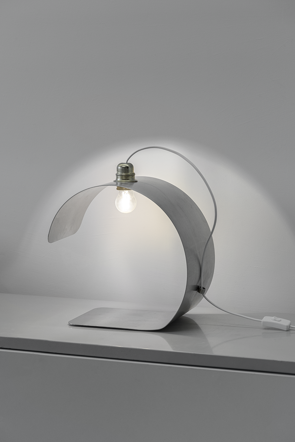 A chapa metálica curvada do candeeiro de mesa de Zuzanna Sikora funciona simultaneamente como material primordial da sua construção e como elemento refletor da luz.