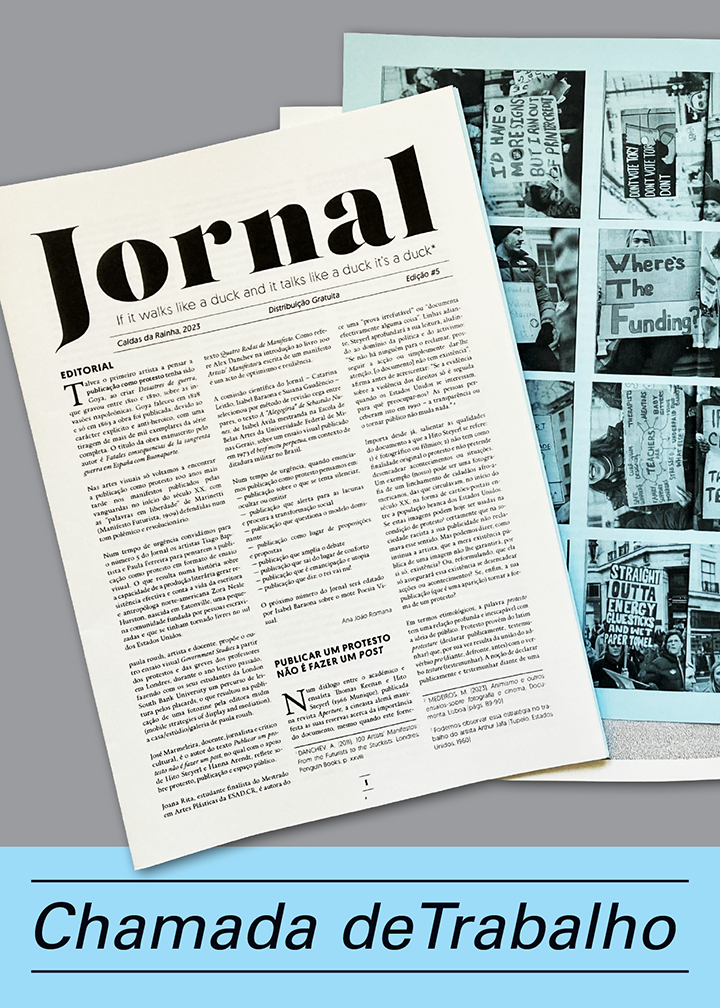 JORNAL, if it walks like a duck and it talks like a duck it’s a duck é uma publicação periódica dedicada aos livros de artista e à edição independente. Visa divulgar a produção científica acerca do que designamos como edição de autor, e fomentar a colaboração entre artistas, editores e investigadores, estudantes e professores, que produzam ou que se debrucem sobre estes objectos, ou que estudem assuntos afins. A origem de Jornal, If it walks like a duck and it talks like a duck it’s a duck tem como referência dois projectos editoriais desenvolvidos por escolas de referência, como o Journal of Artists’ Books[1] (ed. Columbia College Chicago) e Sans Niveau Ni Metre[2] (Cabinet du Livre d’Artiste/Universidade Rennes 2).