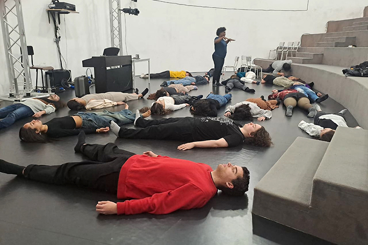 “A aula de corpo foi direcionada à qualidade de movimento, de modo a permitir ao estudante explorar vários movimentos, facilitando a criação, de forma orgânica e consciente, para evitar movimentos mecânicos no seu processo e nas suas apresentações. Não trabalhar na totalidade foi a orientação, deixar os movimentos fluírem sem a necessidade de esforços (Estudantes do 1.º ano).
