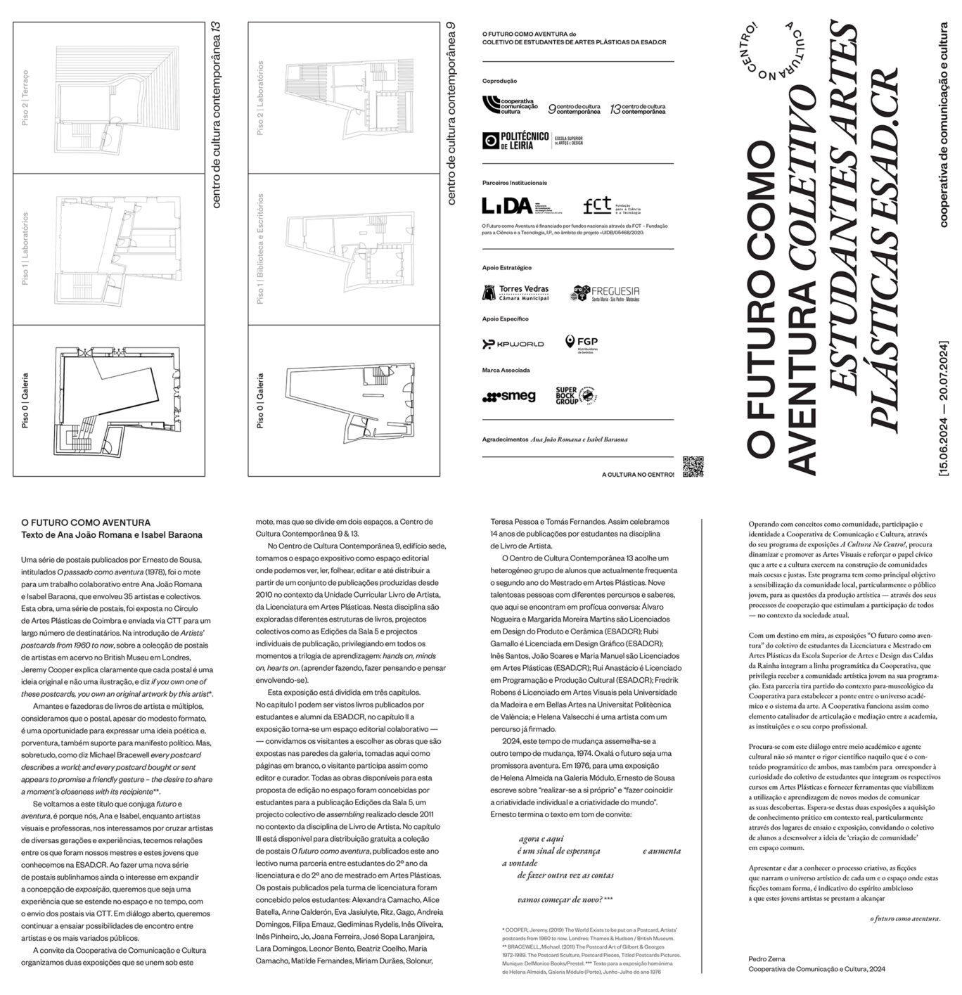Uma série de postais publicados por Ernesto de Sousa, intitulados O passado como aventura (1978), foi o mote para um trabalho colaborativo entre Ana João Romana e Isabel Baraona, e 35 artistas e colectivos. Esta obra, em forma de postais, foi exposta no Círculo de Artes Plásticas de Coimbra e enviada via CTT para um largo número de destinatários. Se voltamos a este título que conjuga futuro e aventura, é porque nós, Ana e Isabel, enquanto artistas visuais e professoras, nos interessamos por cruzar gerações e experiências, tecemos relações entre os que foram nossos mestres e estes jovens que conhecemos na ESAD.CR. Interessa-nos igualmente expandir a concepção de exposição, queremos que seja uma experiência que se estende no espaço e no tempo, com o envio dos postais via ctt. Em diálogo aberto, queremos continuar a ensaiar possibilidades de encontro, um futuro auspicioso.
