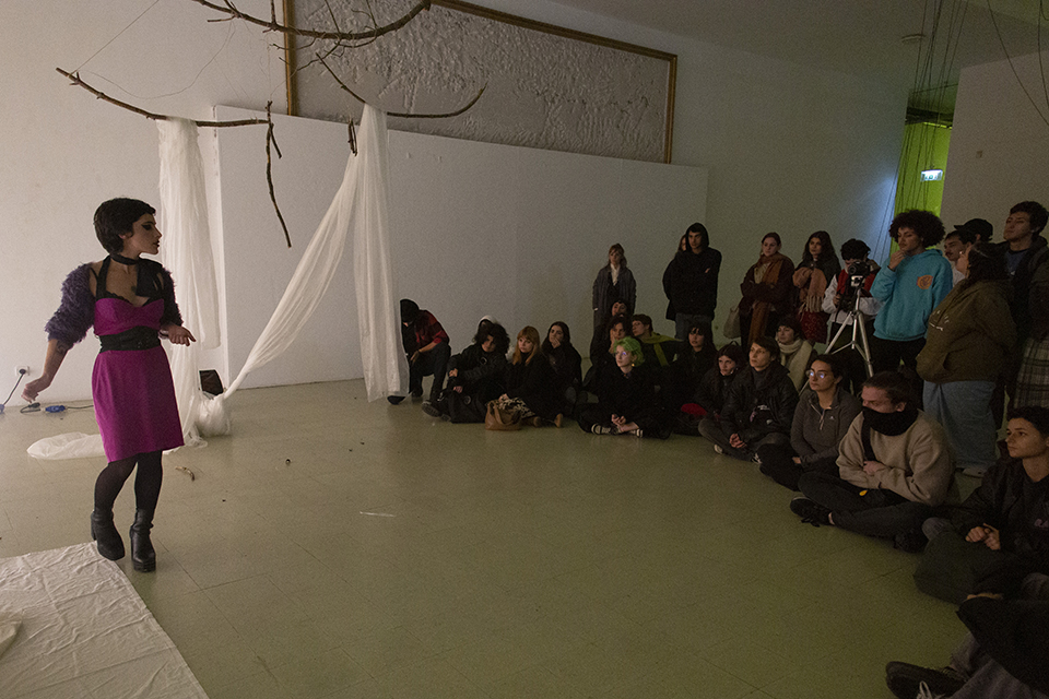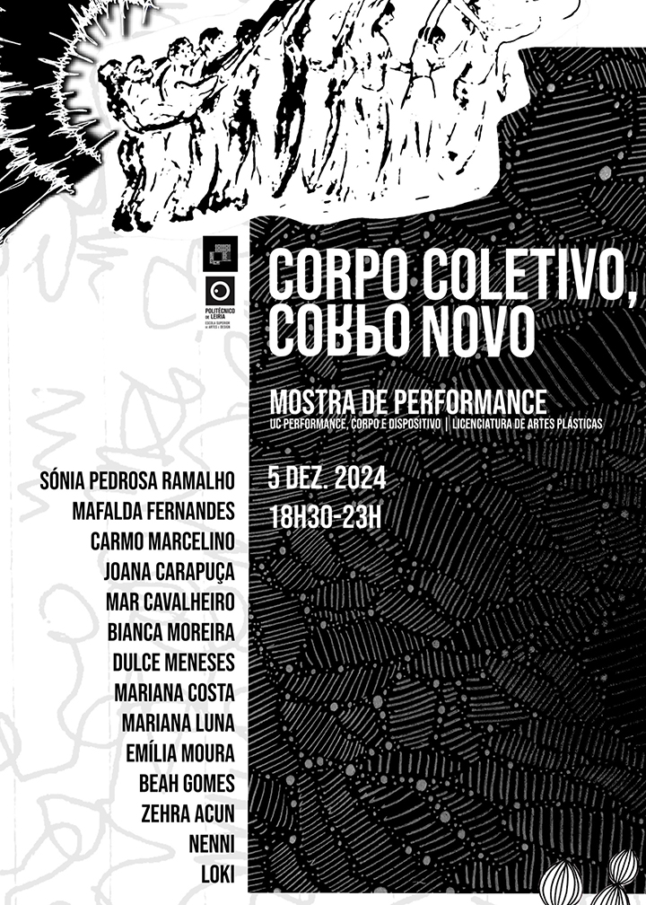 Mostra de performances finais desenvolvidas no âmbito da UC Performance, corpo e dispositivo, com o título corpo coletivo, corpo novo. O título que abre este ciclo de performances surge de um trabalho de partilha e de proximidades em aula, como dançar juntes, caminhar juntes, cuidar juntes, testemunhar juntes e assim nasce um movimento novo, um corpo novo.