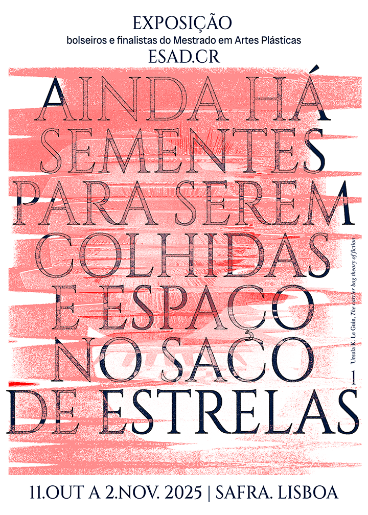 Exposição que reúne as obras de estudantes finalistas do Mestrado em Artes Plásticas do ano lectivo 2024-25 com obras de estudantes bolseiros. É um momento para refletir e celebrar sobre a passagem de testemunho de Luísa Soares de Oliveira, coordenadora do mestrado entre 2014 e 2025, para Ana João Romana. Juntamos nesta exposição várias gerações que têm recebido bolsas dos nossos parceiros institucionais: Rama e Câmara Municipal de Torres Vedras, Prémio Arte Jovem – Millenium BCP, Centre d’Art Contemporain de Meymac, Oficina Bartolomeu Cid dos Santos, LIDA – Laboratório de Investigação em Arte e Design da ESAD.CR, e estudantes que receberam bolsas da Comunidade Europeia para realizar estágios em ateliers de artistas internacionais.