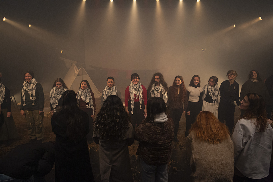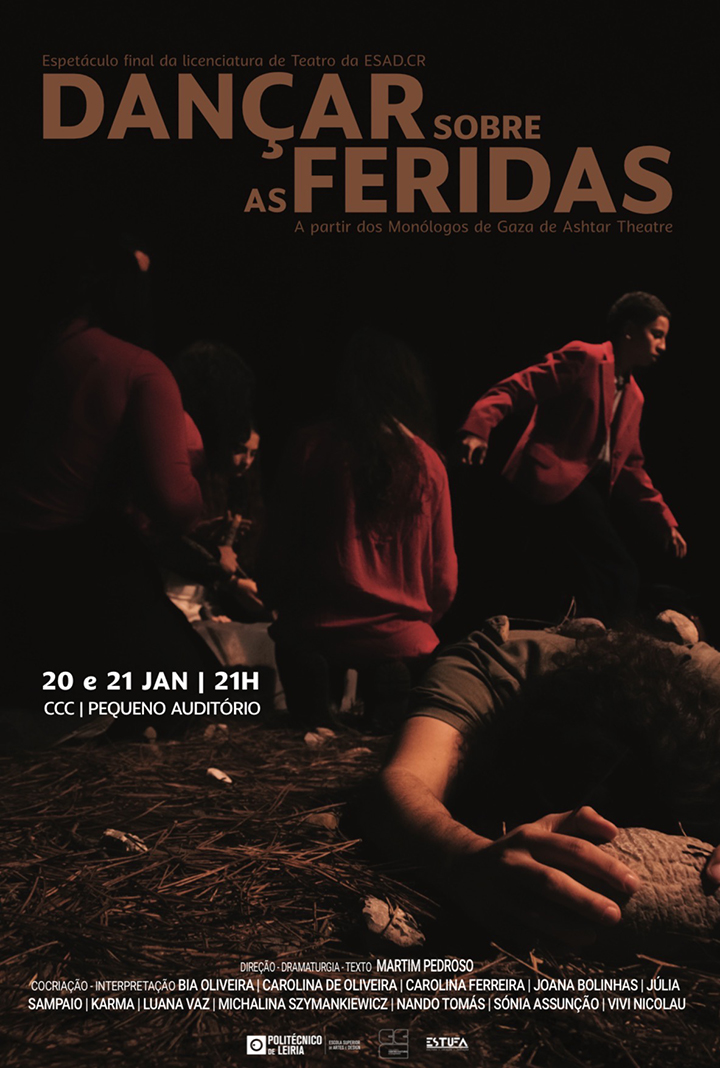 Dançar sobre as feridas é um espetáculo de ecos, sons e memórias de crianças que, entretanto, se tornaram jovens adultos e que têm vindo a sobreviver à violência diária da ocupação, do apartheid, da limpeza étnica e do genocídio no território palestiniano. A partir de testemunhos reais retirados das compilações The Gaza Monologues (2010) e The New Gaza Monologues (2024) editadas pela Ashtar Theatre, uma das companhias e escolas de formação teatral mais relevantes da Palestina, construímos um objeto entre a performance e o teatro documental cuja missão é a de imiscuir as vozes das nossas jovens intérpretes finalistas da ESAD.CR com as vozes da mais jovem resistência palestiniana. O resultado deste encontro de vozes traduz-se, acima de tudo, num monumento em homenagem a todas as vítimas mortais e aos sobreviventes deste que é já considerado o Holocausto do Séc. XXI.