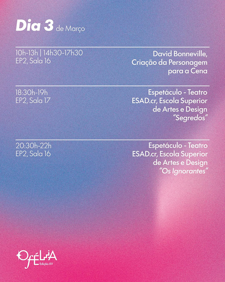 Dinamizado pelo 2.º ano da licenciatura em Teatro da ESAD.CR, o OFÉLIA é mais do que um festival de teatro: é um lugar de encontro, de criação e de partilha. A organização promete uma semana cheia arte e teatro, com a colaboração de escolas como a ACE, ESAD Galicia, entre outras. A programação conta ainda com formações e conversas com grandes nomes como David Bonneville, Joana Pupo, entre outros.