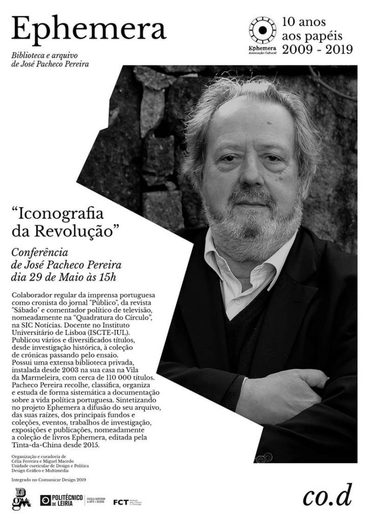 Convidamos toda a comunidade a participar num diálogo com José Pacheco Pereira (dia 29 de Maio às 15h no Auditório EP1). A sua intervenção intitulada “Iconografia da Revolução” apresentará um contexto entre a representação gráfica e o design ao serviço da comunicação política e do seu impacto como meio de intervenção, de agitação, protesto e da liberdade.