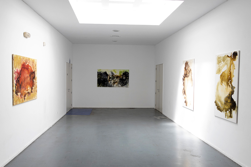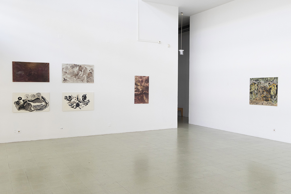 À medida que o trabalho se foi desenvolvendo no ateliê, começou a emergir a ideia de que não há desenhos sem experiência, e de que não há experiência sem memória do corpo que desenha. Sem querer, depressa se percebeu que o desenho se relaciona com o olhar para o chão, tal como nos ensinou Walter Benjamim no seu texto intitulado “sobre o sinal e a mancha”. Percebi isso não por um conhecimento profundo desse texto, mas por uma experiência de infância. A minha avó era cega, e eu desde tenra infância ficava sempre encarregue de a guiar nos espaços exteriores e interiores da casa onde habitava. Isso obrigava-me a estar constantemente atenta ao chão, aos seus percalços, declives acentuados e obstáculos, mas sobretudo, talvez para me evadir dessa tarefa, fascinavam-me a presença da terra na sua secura ou moleza, os musgos e os líquenes logo após as primeiras chuvas, todos com cores que não desbotam com o tempo. Depois de uma vida inteira de trabalho, concorri através do concurso M 23, e pude então realizar a licenciatura e mestrado em Artes Plásticas, na qual pude trabalhar essencialmente o desenho, sempre com matérias que oscilavam entre o estado líquido e o sólido próprio da secagem do primeiro estado. apesar de nunca saber muito bem o que iria fazer a cada início de um novo desenho. Descobri o significado do desenho enquanto acontecimento, à medida que a manipulação das tintas se dava sobre um suporte, e o lugar para onde me levavam estava quase sempre próximo da minha experiência de infância.