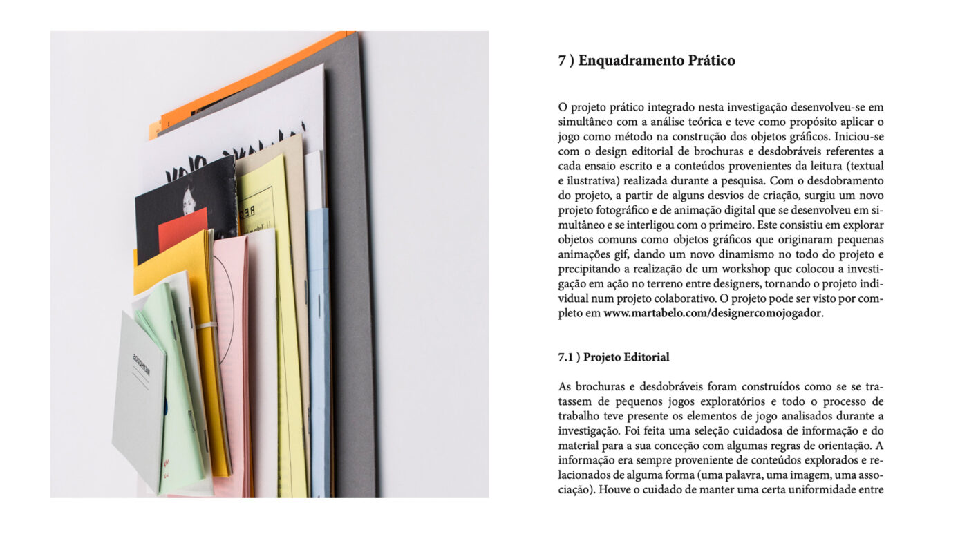 Tal como no jogo a linguagem no design não é passiva, pressupõe ação. A presente investigação coloca o designer como jogador para analisar o jogo como método e avaliar a sua significância na construção da identidade individual e social do designer gráfico. O projeto foi desenvolvido como um sistema de jogo composto por 15 ensaios teóricos e 30 ensaios práticos. Os ensaios teóricos dividem–se em duas partes, o enquadramento histórico e crítico e a análise ao jogo como atividade social e educativa. A primeira parte tem como objetivo compreender o papel do designer e a sua educação. A segunda parte analisa os vários elementos de jogo e avalia-os como método de trabalho. Os ensaios práticos apresentam-se em 16 editoriais e 13 animações, que exploram o jogo como método na conceção dos objetos gráficos, e um workshop, que explora o jogo como método na ação e educação do designer gráfico.