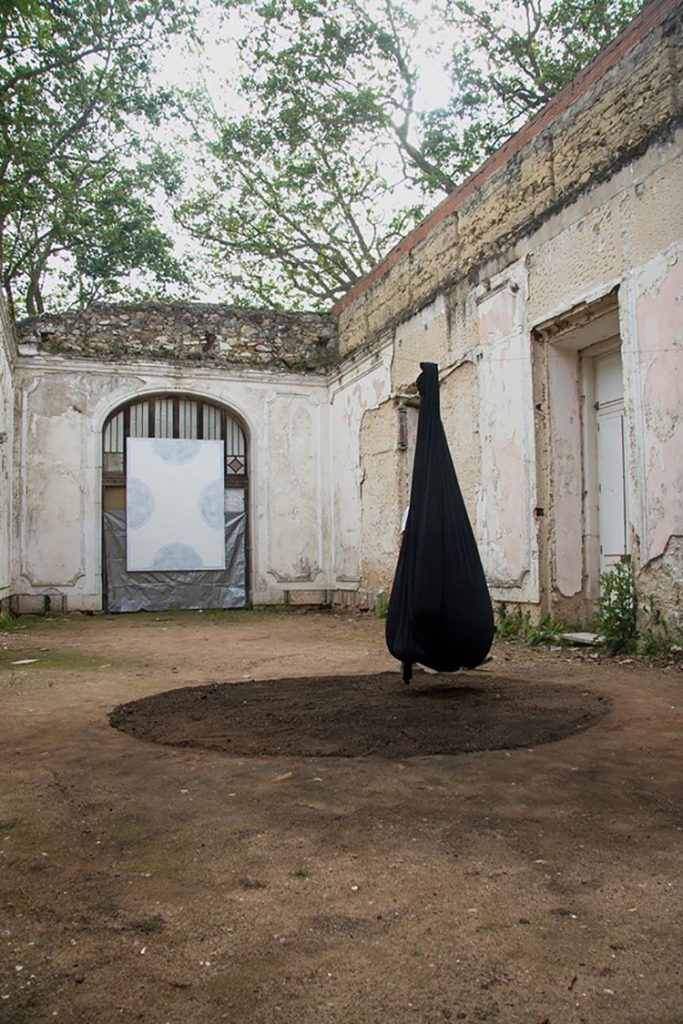Corpo Suspenso, Objeto em licra preta com 1000x150cm sobre círculo em terra com 300cm. Imagem da exposição Noites de Lua Azul, 2018