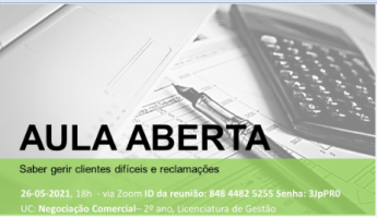 Aula Aberta (26/05/2021) • Titulo do evento: Saber gerir clientes difíceis e reclamações • Oradora: Lurdes Bastida Viana • Resumo da comunicação: ver cartaz • Horário de realização da comunicação:18h00 / Online – Zoom – ID da reunião: 848 4482 5255 Senha: 3JpPR0 • Organizadores do evento: Curso: Gestão – 2º ano – UC: Negociação […]