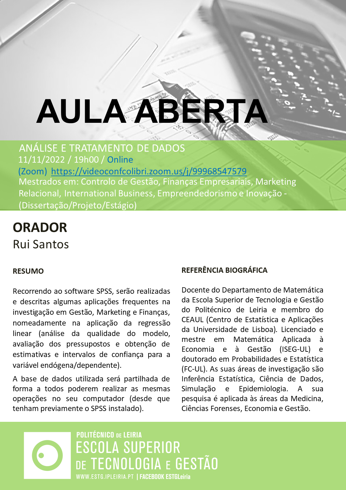 Aula Aberta (11/11/2022) Título do evento: Análise e tratamento de dados Orador: Rui Santos Resumo da comunicação: ver cartaz Horário de realização da comunicação: 19h00 – Online (Zoom) https://videoconfcolibri.zoom.us/j/99968547579 Organizadores do evento: Mestrados: Controlo Gestão; Finanças Empresariais; International Business; Marketing Relacional; Empreendedorismo e Inovação – Dissertação/Projeto/Estágio