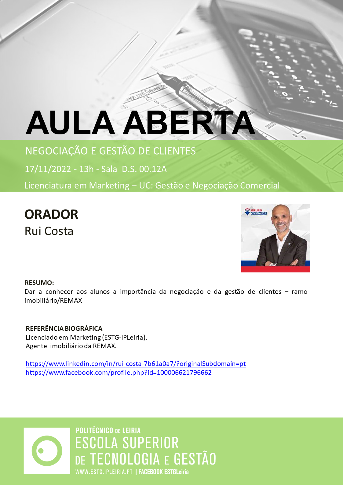 Aula Aberta (17/11/2022) Título do evento: Negociação e gestão de clientes Orador: Rui Costa Resumo da comunicação: ver cartaz Horário de realização da comunicação: 13h00 – D.S. 00.12A Organizadores do evento: Licenciatura em Marketing – UC: Gestão e Negociação Comercial