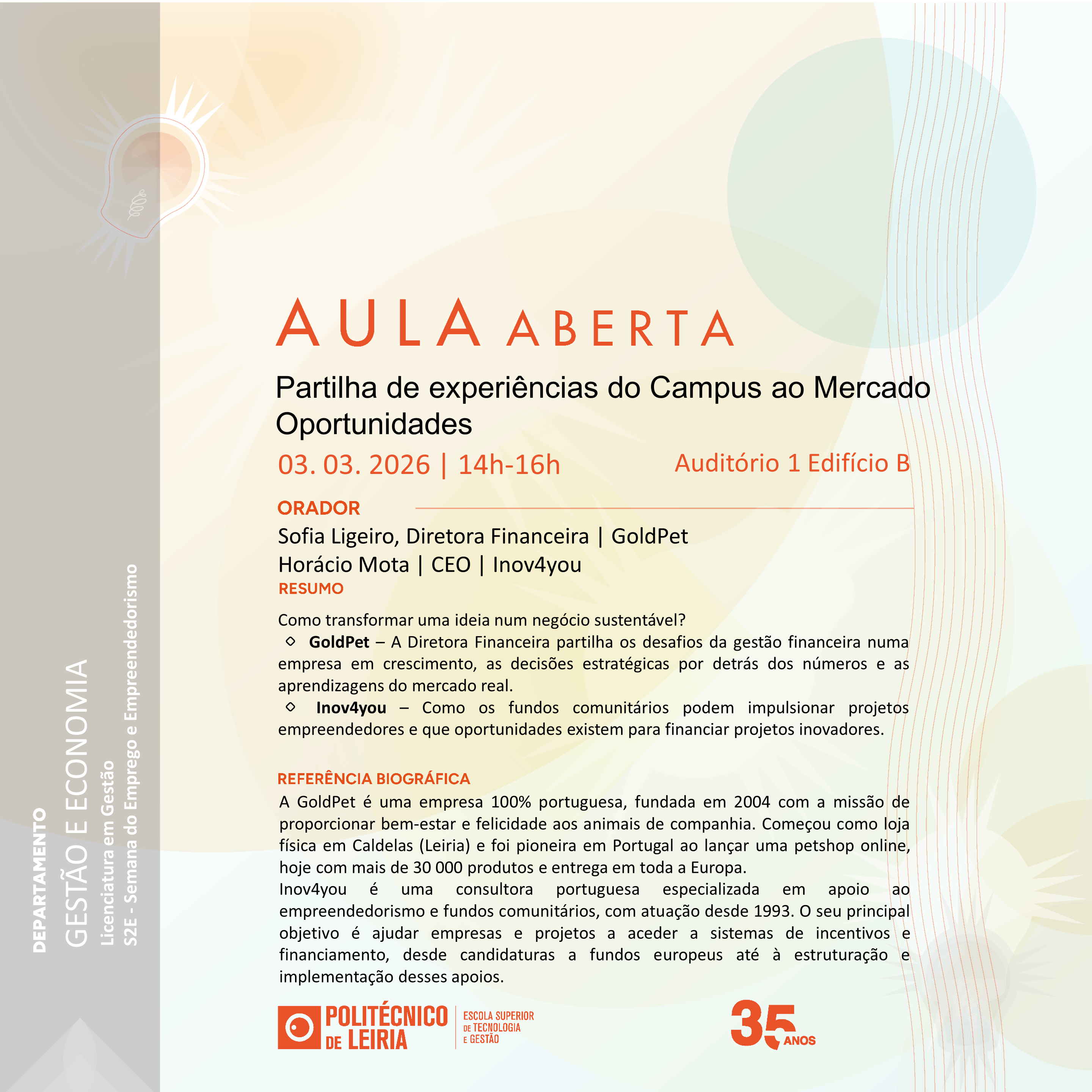 Aula Aberta (03/03/2026) Título do evento: Partilha de experiências do Campus ao Mercado Oportunidades Oradores: Sofia Ligeiro, Diretora Financeira | GoldPet e Horácio Mota | CEO | Inov4you Resumo da comunicação: ver cartaz Horário de realização da comunicação: 14h00 – Auditório 1 Edifício B Organizadores do evento: Licenciatura em Gestão – S2E – Semana do Emprego e Empreendedorismo