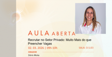 Aula Aberta (02/03/2026) Título do evento: Recrutar no Setor Privado: Muito Mais do que Preencher Vagas Oradora: Dóris Mota Resumo da comunicação: ver cartaz Horário de realização da comunicação: 09h00 – D.S. 0.3 Organizadores do evento: Mestrado em Gestão – S2E – Semana do Emprego e Empreendedorismo