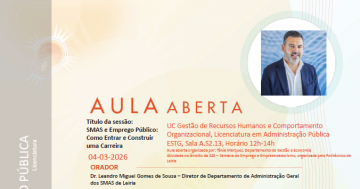 Aula Aberta (04/03/2026) Título do evento: SMAS e Emprego Público: Como Entrar e Construir uma Carreira Orador: Dr. Leandro Miguel Gomes de Sousa Resumo da comunicação: ver cartaz Horário de realização da comunicação: 12h00 – A.S2.13 Organizadores do evento: Licenciatura em Administração Pública – S2E – Semana do Emprego e Empreendedorismo