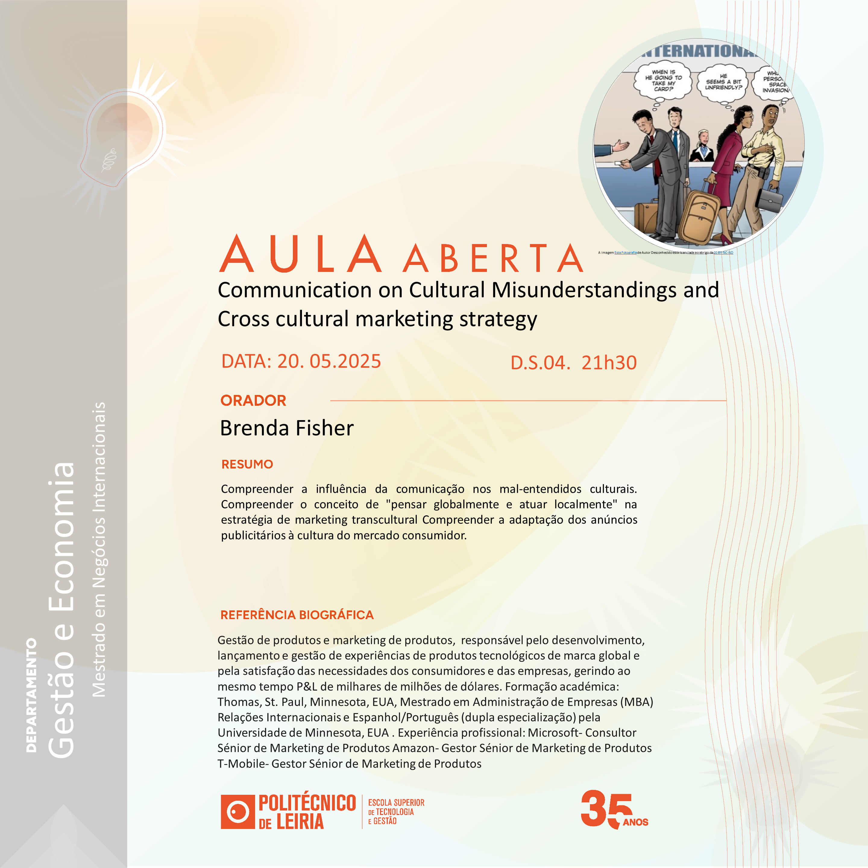 Aula Aberta (10/12/2025) Título do evento: A Viabilidade financeira do negócio; A Propriedade intelectual – marcas, patentes e direitos de autor Oradores: Bruno Ramalho e Filipa Pereira da Cruz Resumo da comunicação: ver cartaz Horário de realização da comunicação: 09h00 – A.S2.15 Organizadores do evento: Licenciatura em Gestão