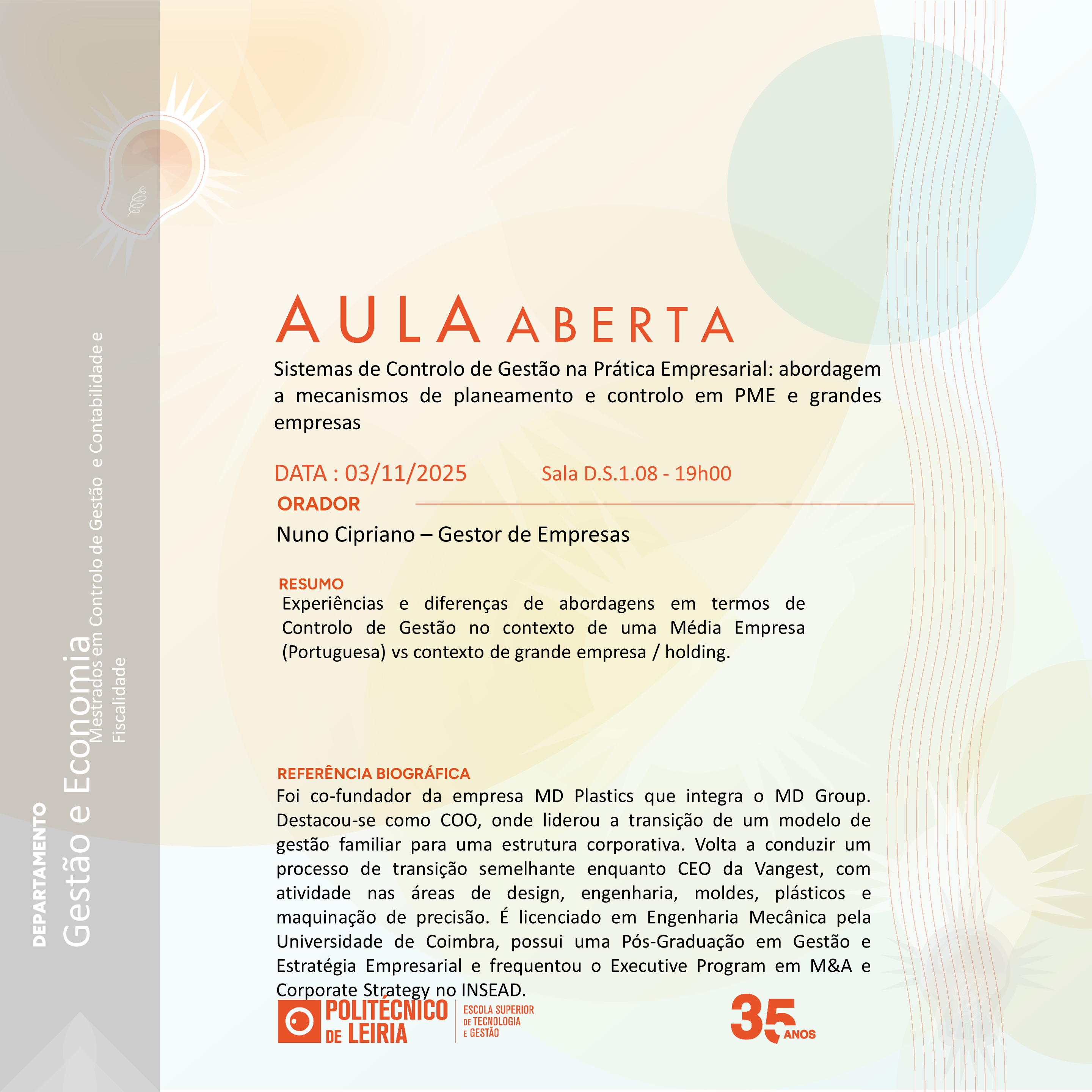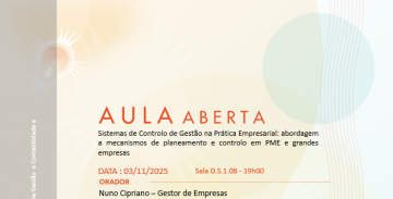 Aula Aberta (03/11/2025) Título do evento: Sistemas de Controlo de Gestão na Prática Empresarial: abordagem a mecanismos de planeamento e controlo em PME e grandes empresas Orador: Nuno Cipriano – Gestor de Empresas Resumo da comunicação: ver cartaz Horário de realização da comunicação:19h00 – D.S. 1.08 Organizadores do evento: Mestrados em Controlo de Gestão e Contabilidade e Fiscalidade