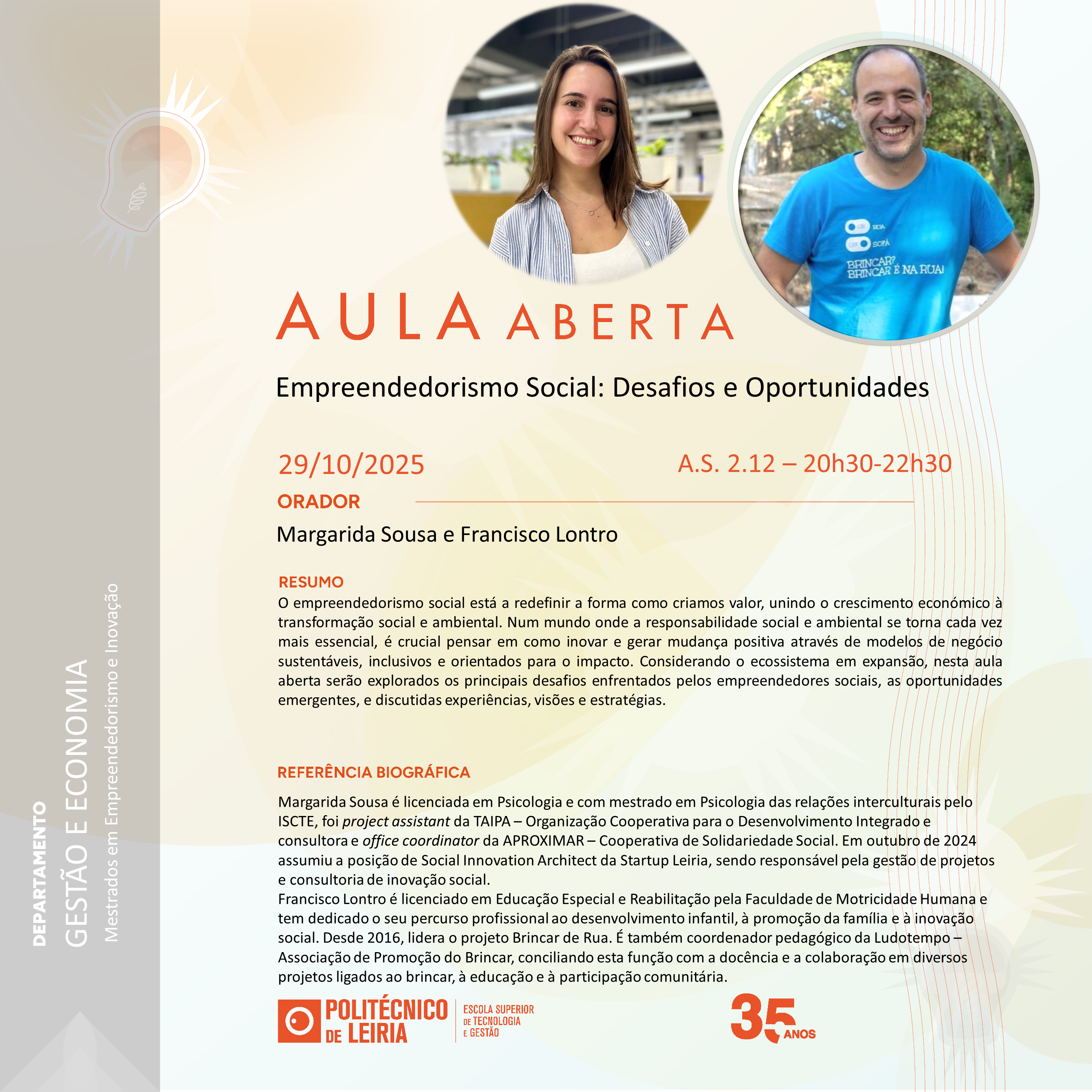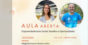 Aula Aberta (29/10/2025) Título do evento: Empreendedorismo Social: Desafios e Oportunidades Oradores: Margarida Sousa e Francisco Lontro Resumo da comunicação: ver cartaz Horário de realização da comunicação: 20h30 – A.S. 2.12 Organizadores do evento: Mestrado em Empreendedorismo e Inovação