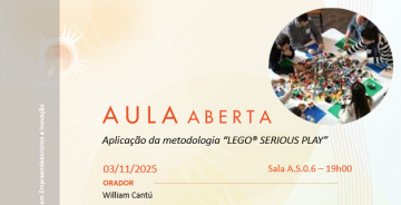 Aula Aberta (03/11/2025) Título do evento: Aplicação da metodologia “LEGO® SERIOUS PLAY” Orador: William Cantú Resumo da comunicação: ver cartaz Horário de realização da comunicação: 19h00 – A.S. 0.6 Organizadores do evento: Mestrado em Finanças Empresariais e Mestrado em Empreendedorismo e Inovação