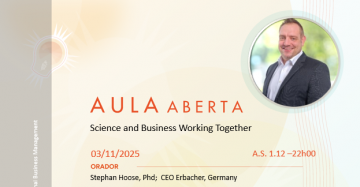 Aula Aberta (03/11/2025) Título do evento: Science and Business Working Together Orador: Stephan Hoose, Phd; CEO Erbacher, Germany Resumo da comunicação: ver cartaz Horário de realização da comunicação:22h00 – A.S. 1.12 Organizadores do evento: Mestrado International Business – UC: International Business Management