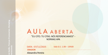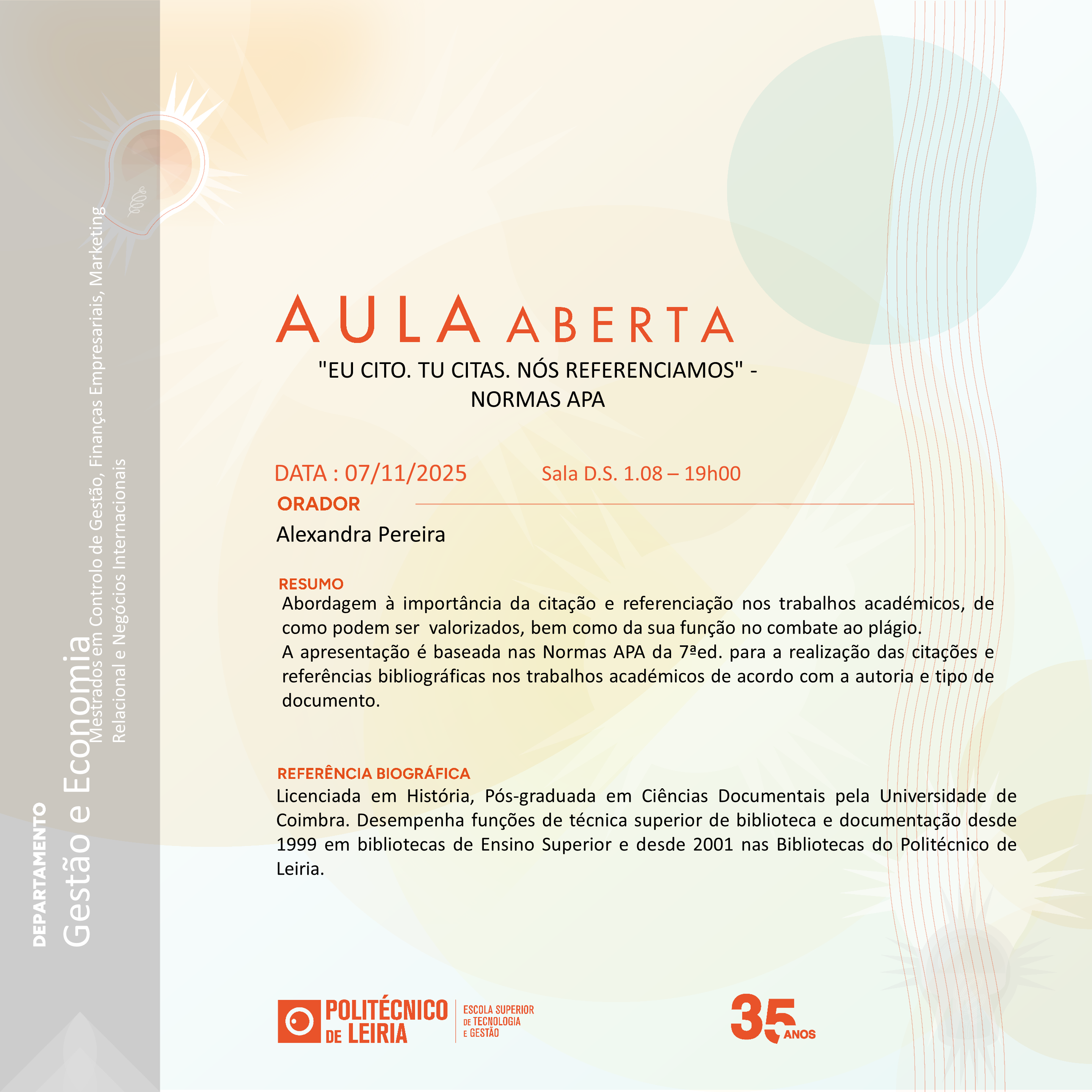 Aula Aberta (07/11/2025) Título do evento: “Eu cito. Tu citas. Nós referenciamos” – Normas APA Oradora: Alexandra Pereira Resumo da comunicação: ver cartaz Horário de realização da comunicação: 19h00 – D.S. 1.08 Organizadores do evento: Mestrados em Controlo de Gestão, Finanças Empresariais, Marketing Relacional e Negócios Internacionais