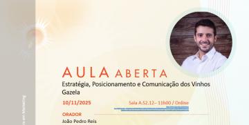 Aula Aberta (10/11/2025) Título do evento: Estratégia, Posicionamento e Comunicação dos Vinhos Gazela Orador: João Pedro Reis Resumo da comunicação: ver cartaz Horário de realização da comunicação: 11h00 – A.S. 2.12/Online Organizadores do evento: Licenciatura em Marketing