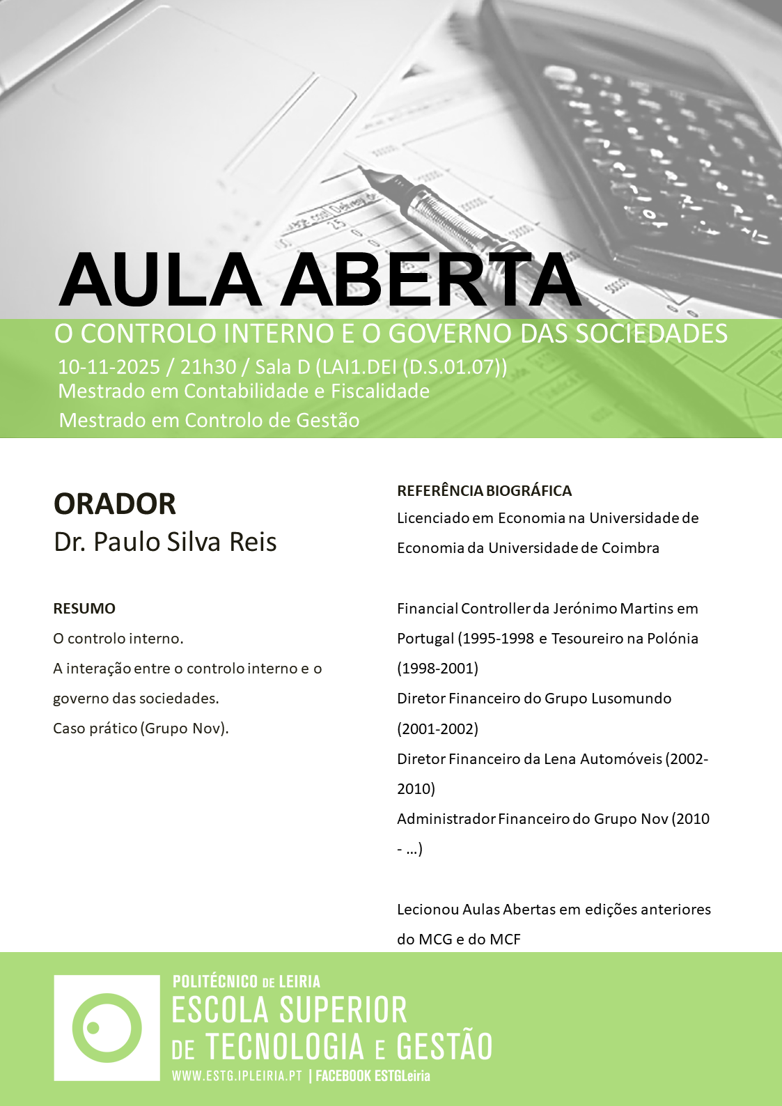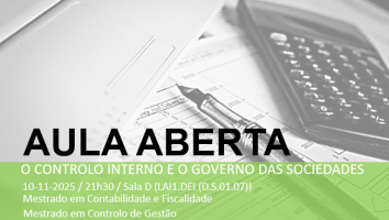 Aula Aberta (10/11/2025) Título do evento: O controlo interno e o governo das sociedades Orador: Dr. Paulo Silva Reis Resumo da comunicação: ver cartaz Horário de realização da comunicação: 21h30 – A.S. 2.12/Online Organizadores do evento: Mestrados em Controlo de Gestão e Contabilidade e Fiscalidade