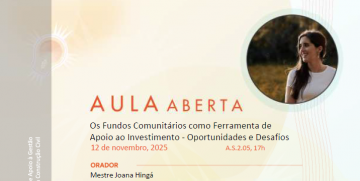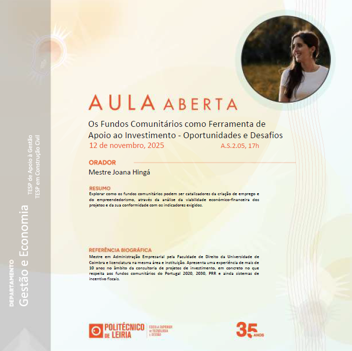 Aula Aberta (12/11/2025) Título do evento: Os Fundos Comunitários como Ferramenta de Apoio ao Investimento – Oportunidades e Desafios Oradora: Mestre Joana Hingá Resumo da comunicação: ver cartaz Horário de realização da comunicação: 17h00 – A.S. 2.05 Organizadores do evento: Tesp em AG e CC