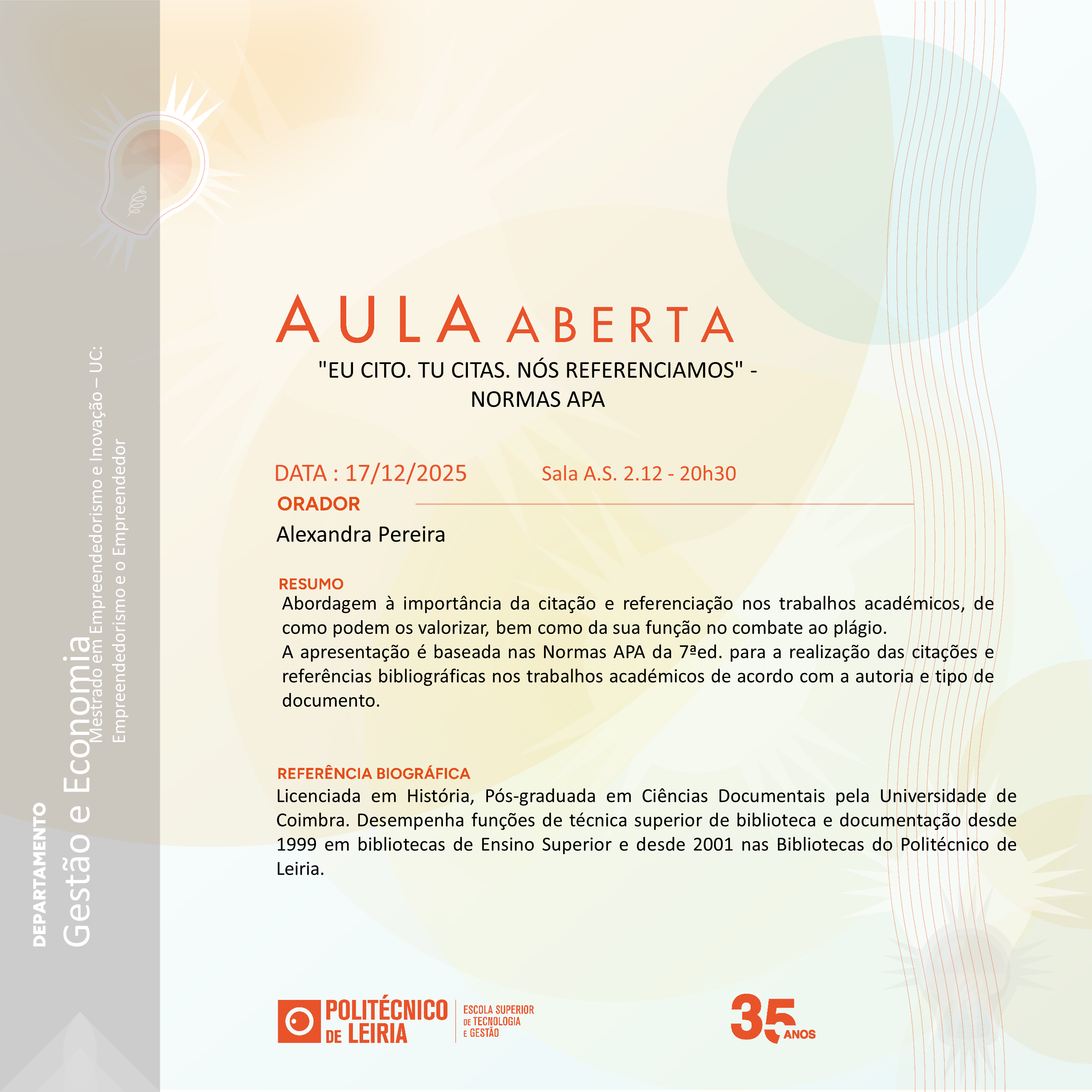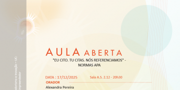 Aula Aberta (17/12/2025) Título do evento: “Eu cito. Tu citas. Nós referenciamos” – Normas APA Oradora: Alexandra Pereira Resumo da comunicação: ver cartaz Horário de realização da comunicação: 20h30 – A.S. 2.12 Organizadores do evento: Mestrado em Empreendedorismo e Inovação
