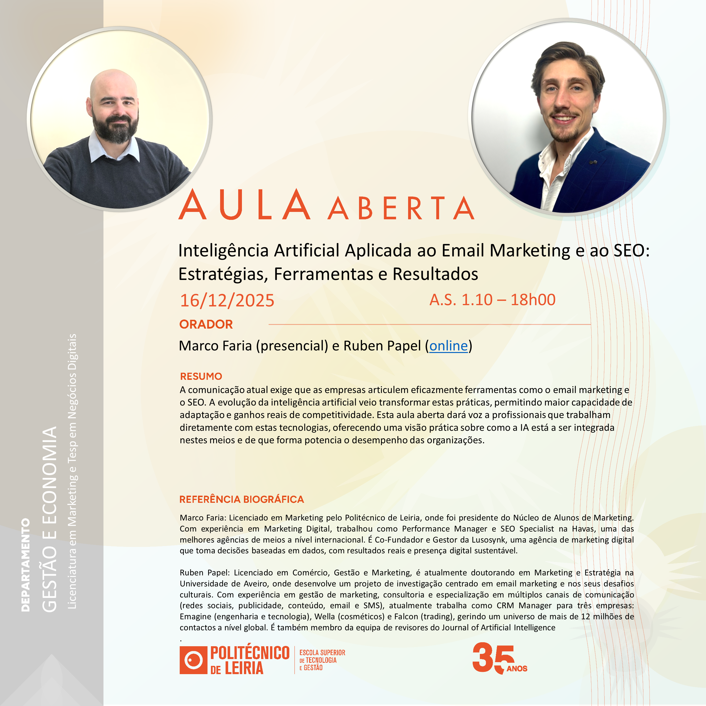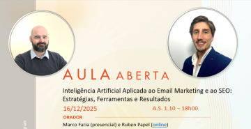 Aula Aberta (16/12/2025) Título do evento: Inteligência Artificial Aplicada ao Email Marketing e ao SEO: Estratégias, Ferramentas e Resultados Oradores: Marco Faria (presencial) e Ruben Papel (online) Resumo da comunicação: ver cartaz Horário de realização da comunicação: 18h00 – A.S. 1.10 Organizadores do evento: Licenciatura em Marketing e Tesp em Negócios Digitais