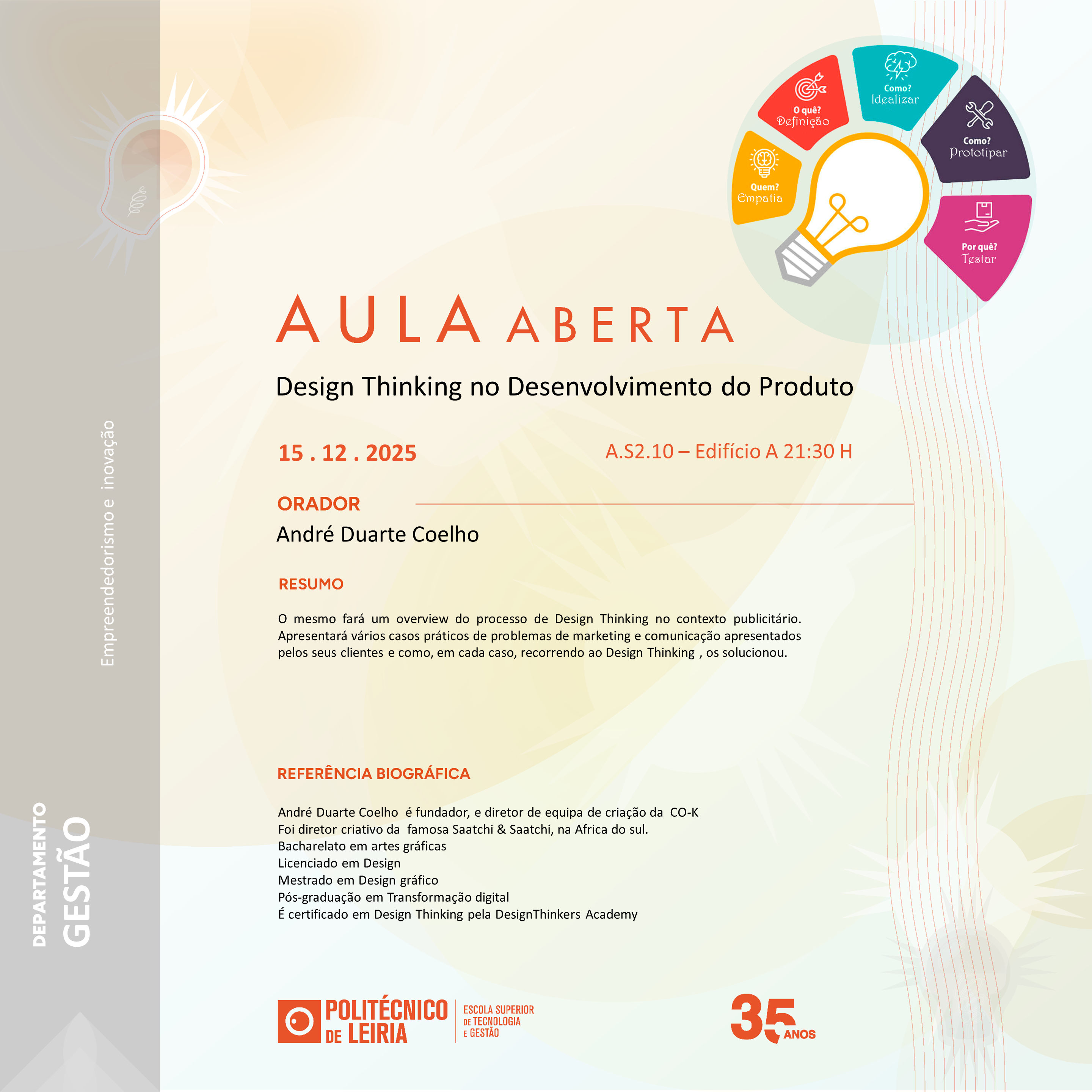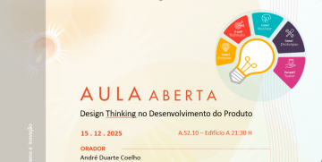 Aula Aberta (15/12/2025) Título do evento: Design Thinking no Desenvolvimento do Produto Orador: André Duarte Coelho Resumo da comunicação: ver cartaz Horário de realização da comunicação: 21h30 – A.S2.10 Organizadores do evento: Mestrado em Empreendedorismo e Inovação